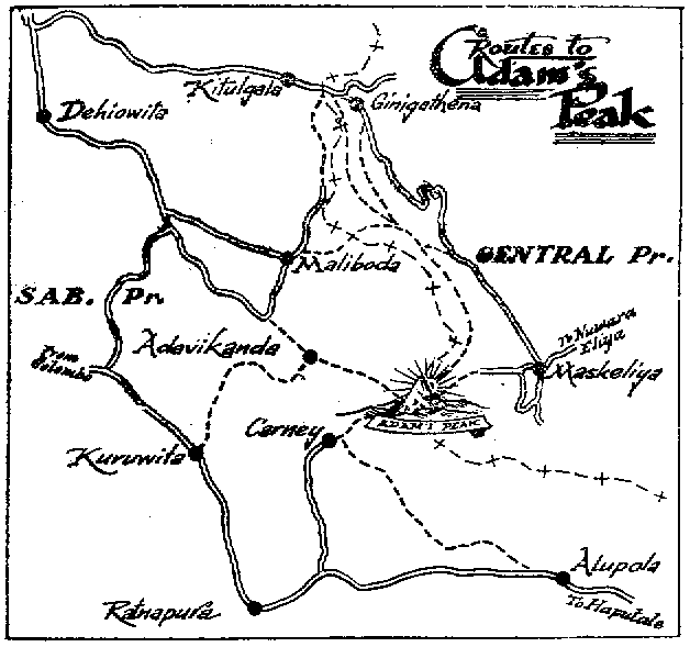 [අනුවාදක සටහන: ශ්රී පාදය කරුණා කල හැකි මාර්ග හයකි. එඩ්වඩ් කාපෙන්ටර් ඉතාම පහසු මාර්ගය වූ හැටන්-නල්ලතන්නි මාර්ගය ඔස්සේ ඉහළට කරුණාකොට, ඉතාම අපහසු, පැරණිතම මාර්ගය වූ රජ මාවත, එනම් රත්නපුර-පළාබද්දල හරහා පහළට කරුණාකොට ඇති සෙයකි. අනෙකුත් මාර්ග වන්නේ කුරුවිට-එරත්න මාර්ගය, මරේ වත්ත (රාජමලේ-සඳගලතැන්න) මාර්ගය, මුක්කුවත්ත මාර්ගය සහ මාලිබොඩ (දැරණියගල) මාර්ගයයි.]